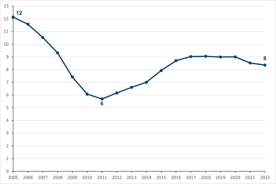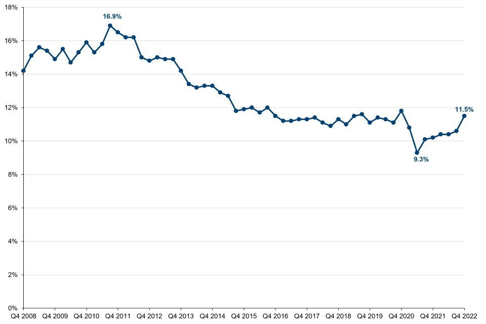 11.5% of young people (aged 16 to 24) who are not in education, employment or training (NEET) (UK), 2007 to 2022