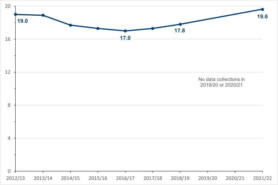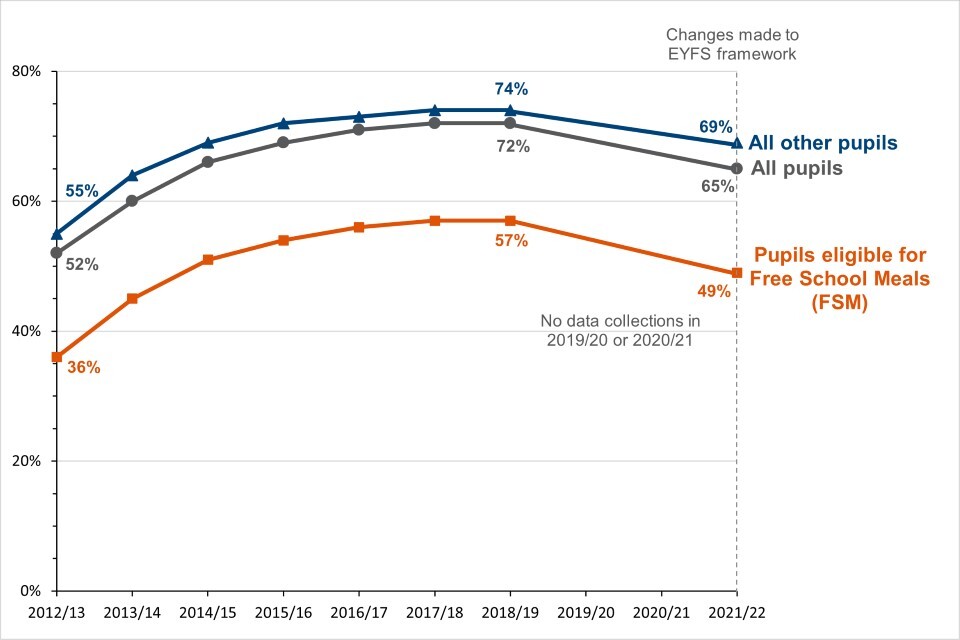 In 2021/22, the percentage of children with a good level of development was 19.6 percentage points lower for children eligible for free school meals than for all other children. Though not directly comparable because of reforms to the EYFSP, the 2018/19 figure was 17.8 percentage points.