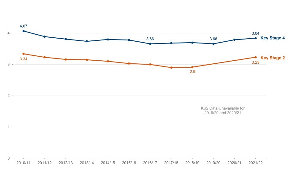 The disadvantage attainment gap at Key Stage 4 was 3.84 in 2021/22 which has risen from 3.79 in 2020/21.