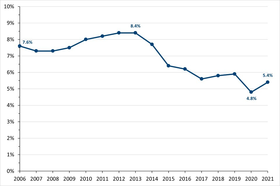 Proportion of young people aged 18 to 24 who have not been in employment or full-time education for two years or more (UK), 2006 to 2021