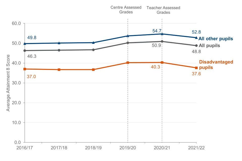 In 2021/22, the average attainment 8 score for disadvantaged pupils was 37.6. Comparatively, the average attainment 8 score of non-disadvantaged pupils was 52.8.