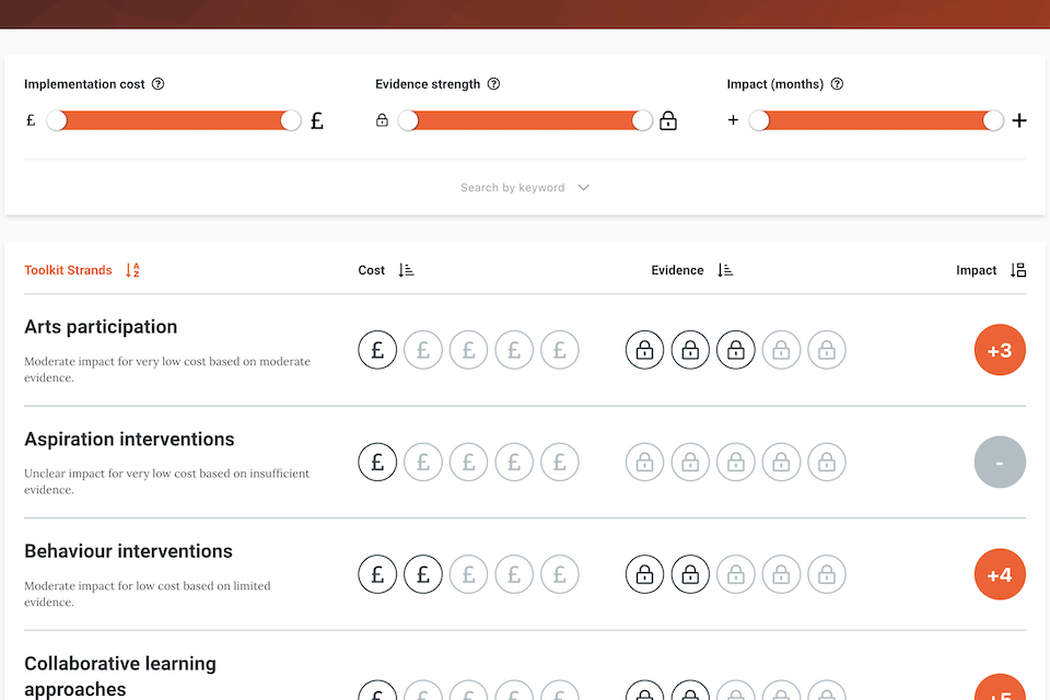 Figure 1 shows how this synthesised and systematised evidence is presented to users. Toolkit users who want to understand the efficacy and strength of evidence of various educational interventions can filter these interventions by 3 indicators: impact, evidence strength, and implementation cost.