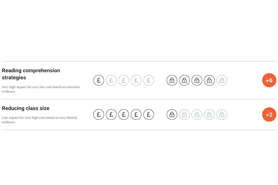 To further elucidate the comparative function of the tool, Figure 2 below gives an example of 2 interventions within the toolkit – reading comprehension strategies and reducing class size. The toolkit indicates that on one hand, reading comprehension strategies are a ‘very low cost’, ‘very high impact’ intervention for which there is ‘extensive evidence’, while reducing class sizes is a ‘very high cost’, ‘low impact’ intervention with ‘very limited evidence’. This clear comparative format allows educators to make evidence-based judgements about which interventions are more worthwhile than others, given the latest evidence and given their own context.