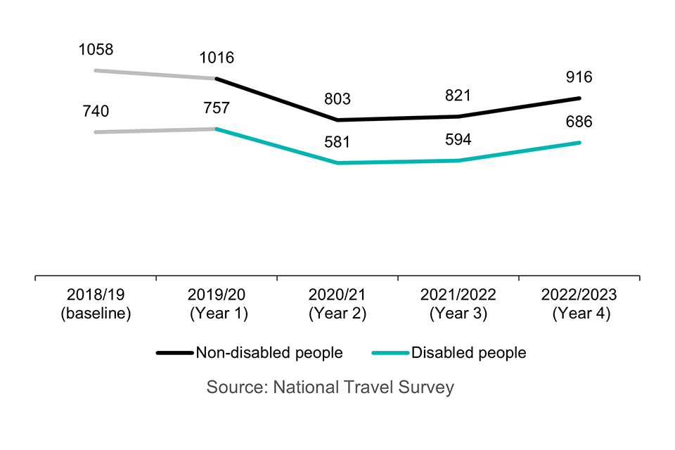 This trend is consistent with the average number of trips taken by non-disabled people and it is likely that the COVID-19 pandemic and following recovery contributed to these changes.