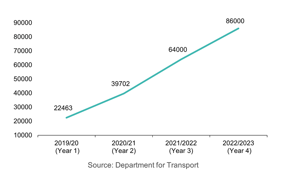 In the first scorecard year (2019 to 2020) this was 22,463 and in the last scorecard year (2022 to 2023) this was 86,000. The percentage of taxis that were wheelchair accessible slightly decreased overall, while for PHVs this remained consistent.