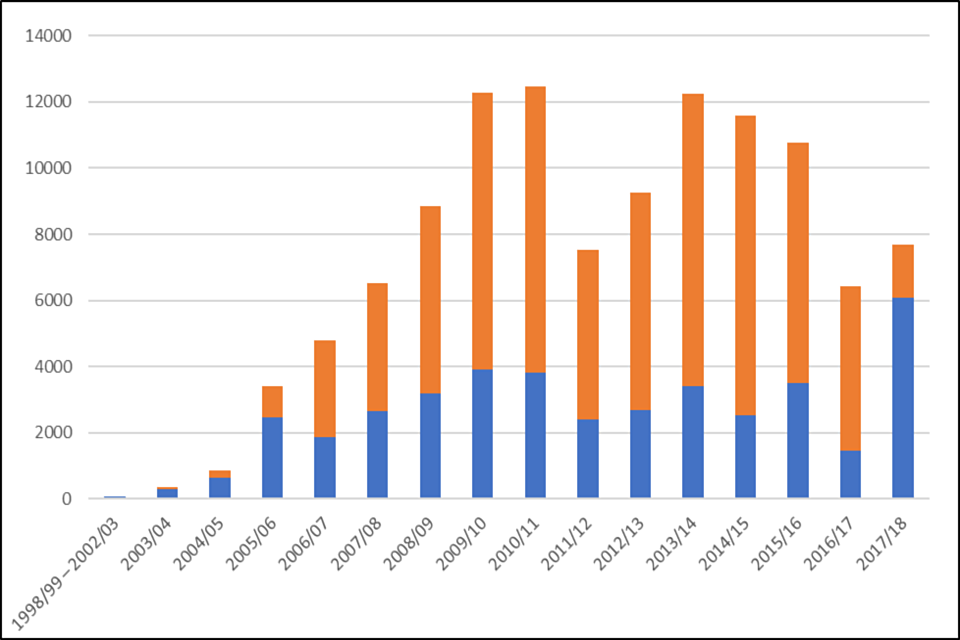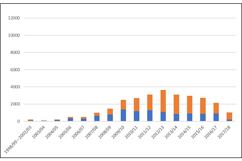 Tables 1 and 2 below show the underlying data for these charts, up to and including 2017 to 2018.