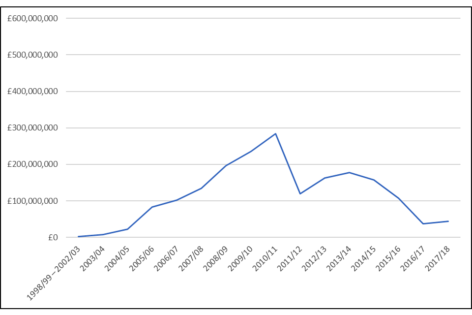 | 2010 to 2011 | £284,000,000 | £317,000,000 |