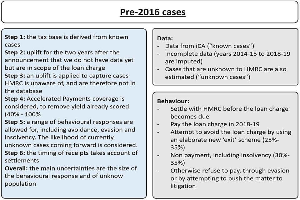 The costing excludes revenue that has been scored under the Accelerated Payments measure from Budget 2014. It is anticipated that some cases that have previously been included in the Accelerated Payments measure might end up settling, paying the loan charge or deterred from engaging in future avoidance. The yield from these cases have therefore been excluded in the DR costing to avoid double counting.