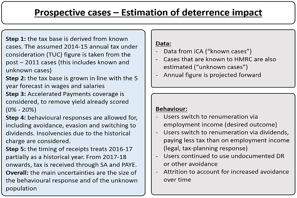 The costing for the DR measure is estimated by firstly determining the value of the tax base. The tax base consists of historic tax due from use of DR avoidance schemes and use anticipated in the future in the absence of a policy change for individuals and employers. The costing accounts for people being unable to pay, as well as those who move to other forms of tax avoidance. It also accounts for a small proportion of previously unidentified cases coming forward.