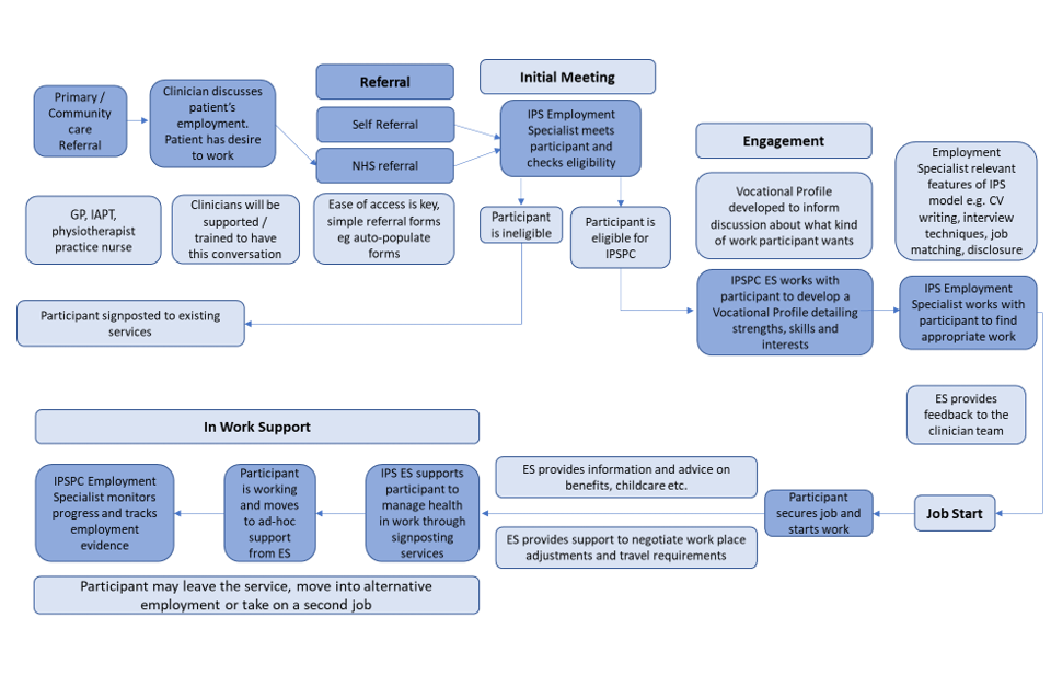 3. IPSPC builds on the core principles and the fidelity scale adopted by the established Individual Placement Support (IPS) model, as well as learning from the IPS Health Led Trials (HLT). IPSPC will be delivered in primary and community NHS (National Health Service) services applying a modified version of the eight key principles of IPS (see paragraph 24) and will be integrated with an individual’s health treatment (as required).