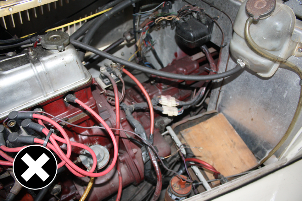 Not allowed: the petrol pipe is rubbing against the HT lead and is not clipped into place.