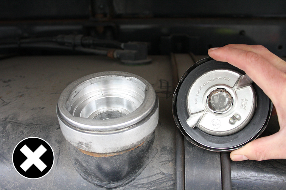 The above image shows a fuel tank cap that isn’t tethered, which isn’t allowed.