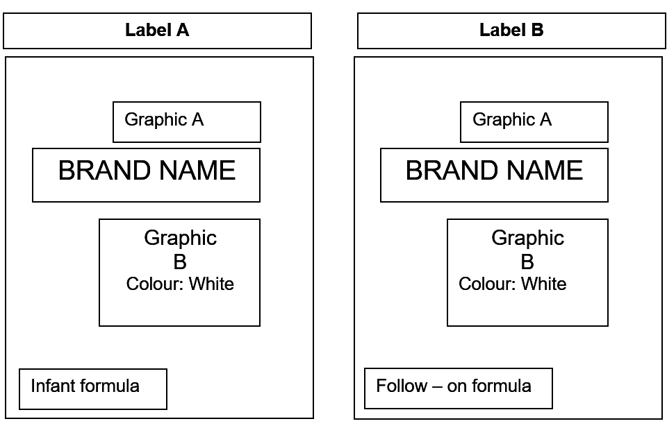 The lack of differentiation between the following examples of product labels (labels A and B) (same colour, graphics and placement and style of text, logos and graphics) may prevent consumers being able to easily distinguish between infant formula and follow-on formula.