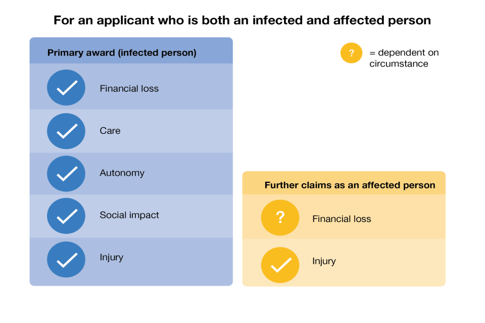| Category of Award | Partner | Child (where onset of parent’s infection began before the child turned 18) | Parent (where child’s infection started before age 18) | Siblings who whilst under the age of 18 lived in the same household as an infected person for at least 2 years after the onset of the infectionˣ | Carers; Parent (where onset of child’s infection began after age 18); Child (where onset of parent’s infection began after child turned 18); All other eligible Siblingsⱽ |