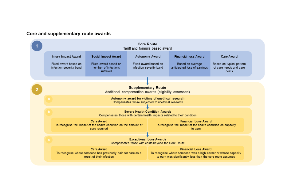 | Autonomy award for victims of unethical research | The first category of award available under the supplementary route, which compensates the victims who were subjected to unethical research practices. This award is only available for infected people that have already been accepted onto the Scheme under the core route. |