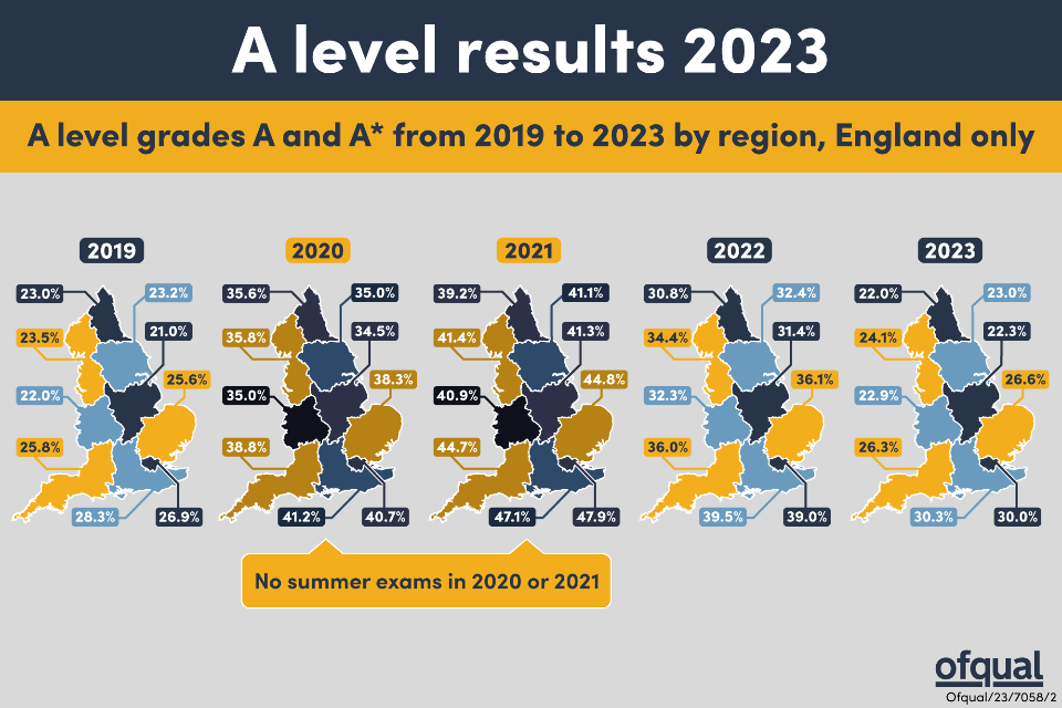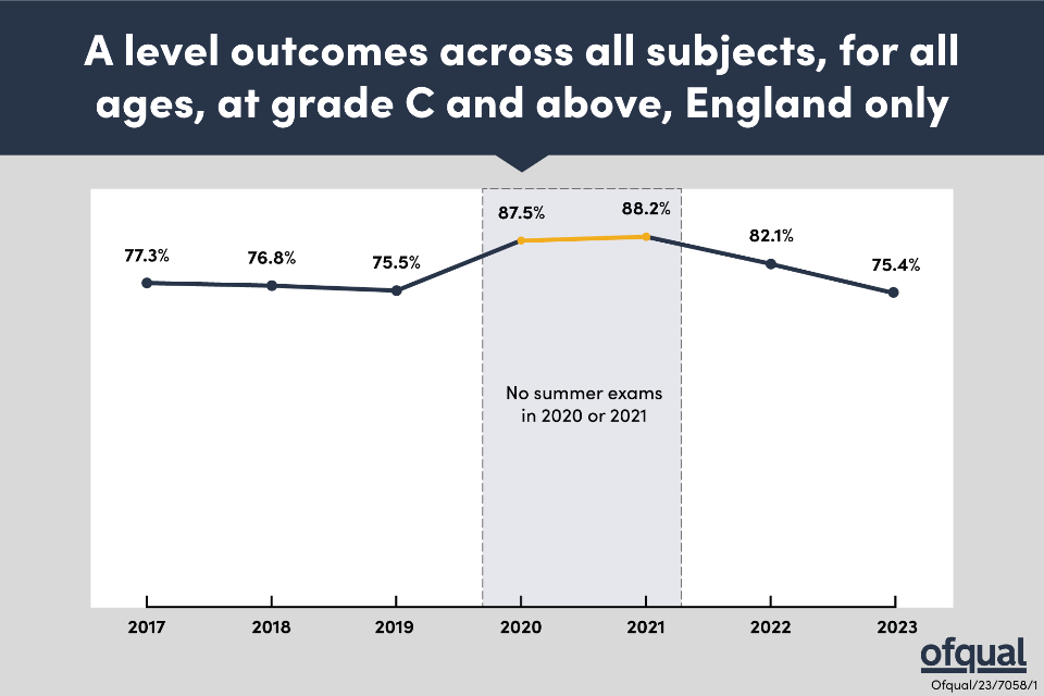 A level outcomes across all subjects, for all ages, at grade C and above, England only