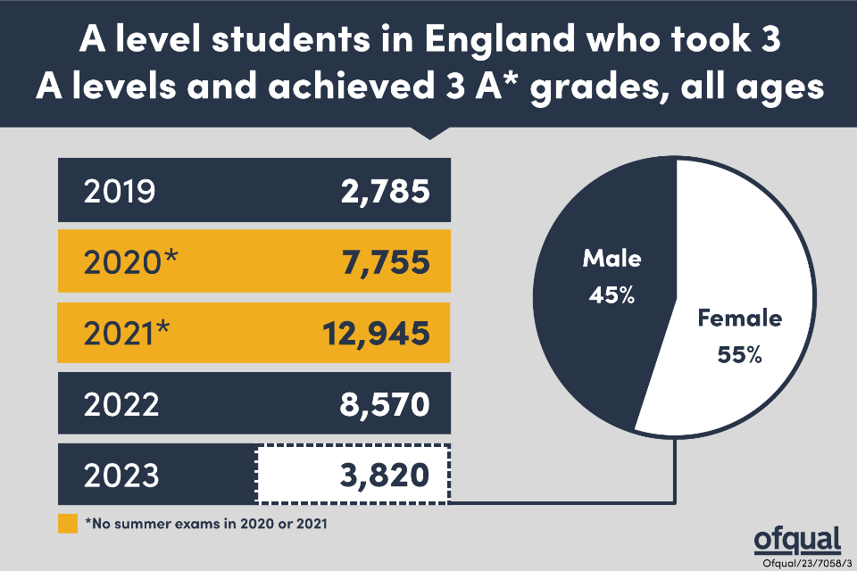 A level students in England who took 3 A levels and achieved 3 A* grades, all ages