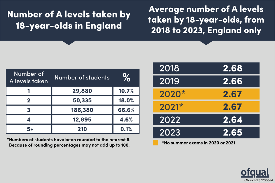 Number of A levels taken by 18-year-olds in England, and average number of A levels taken by 18-year-olds from 2018 to 2023, England only