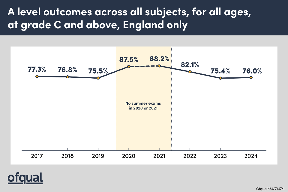 A level outcomes across all subjects, for all ages, at grade C and above, England only