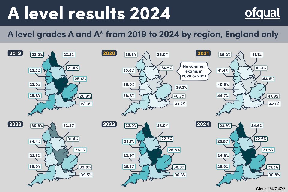 A level grades A and A* from 2019 to 2024 by region, England only