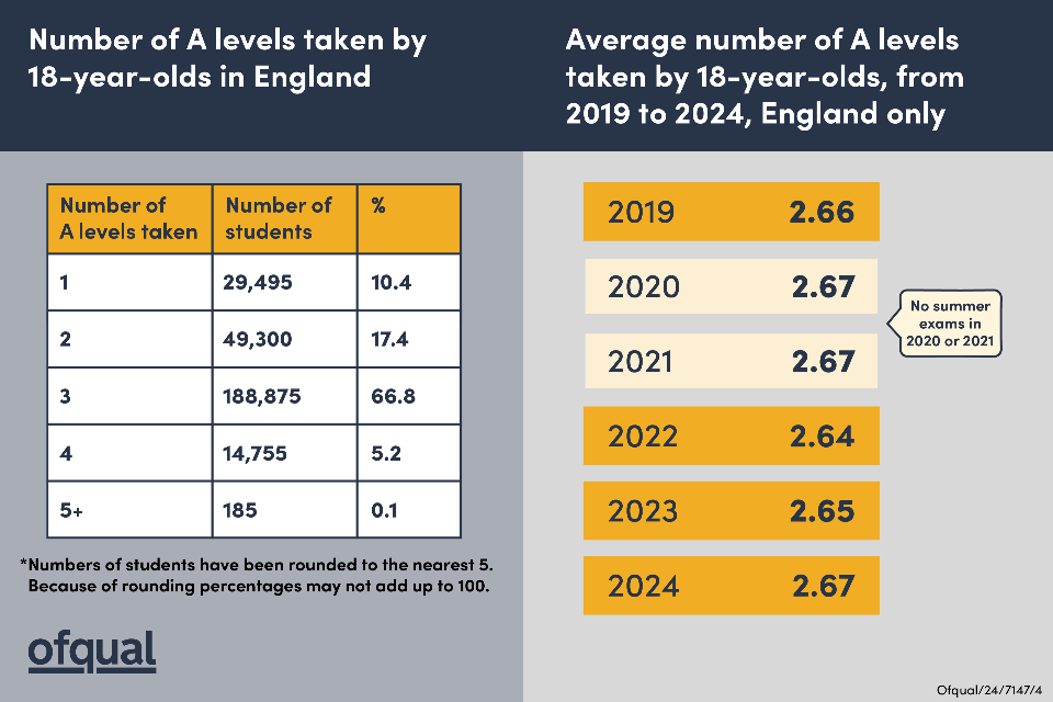 Number of A levels taken by 18-year-olds in England, and average number of A levels taken by 18-year-olds from 2019 to 2024, England only