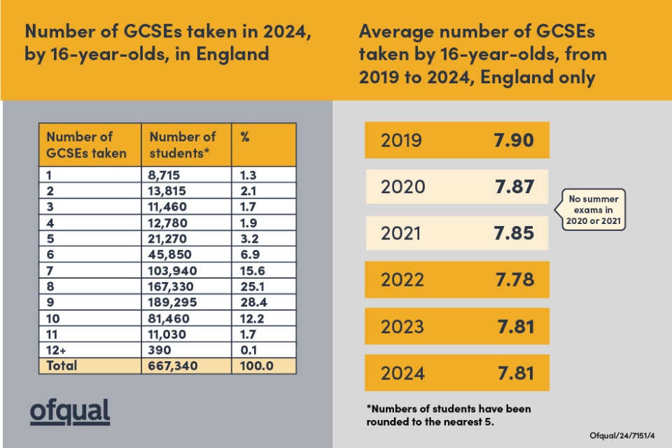 Number of GCSEs taken in 2024 by 16-year-olds, in England and average number of GCSEs taken by 16-year-olds, from 2019 to 2024 — England only