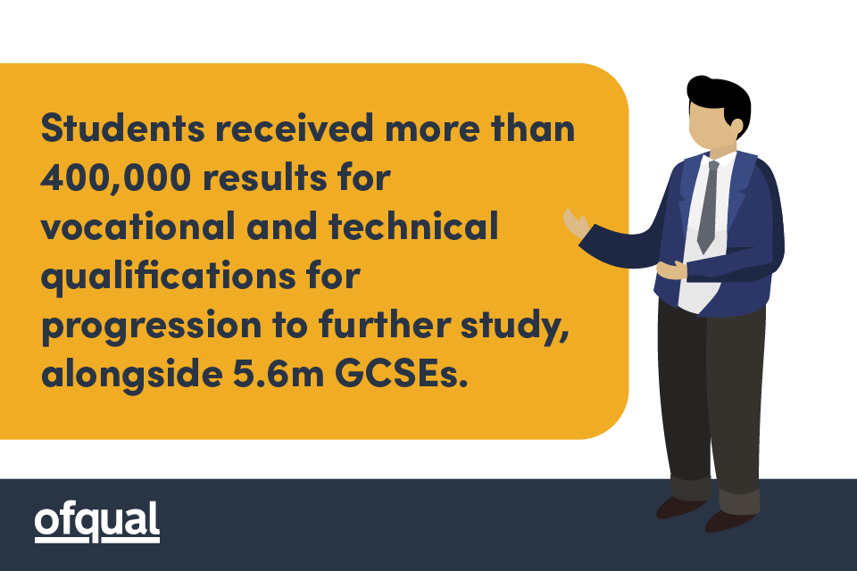 Students received more than 400,000 results for vocational and technical qualifications for progression to further study, alongside 5.6 million GCSEs.