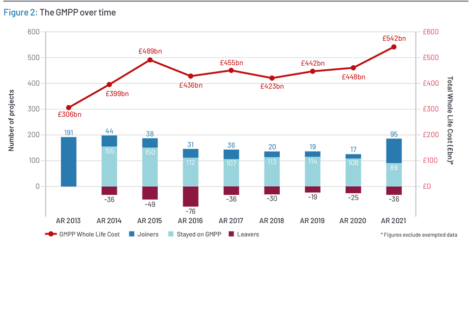 Projects on the GMPP receive independent scrutiny and assurance from the IPA. Expert teams in the IPA also give specialist project delivery, commercial and financial advice, provide practical tools and make specific recommendations to help improve the chance of successful delivery. Projects on the GMPP are required to provide quarterly data returns on delivery progress. This data is used to monitor progress across the portfolio and risks and insights are shared with departments and the centre of government. This year’s GMPP snapshot comprises 184 projects with a total Whole Life Cost (WLC) of £542bn and £826bn of monetised benefits that are delivered by 18 departments and their arm’s-length bodies.