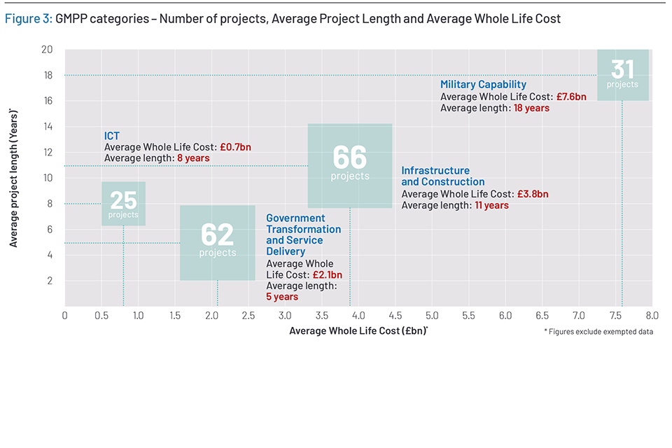 Figure 3: GMPP categories – Number of projects, Average Project Length and Average Whole Life Cost