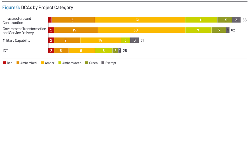 Projects in all the Annual Report categories, except for Military Capability, receive in proportion, similar DCA ratings. On average, 70% of Infrastructure and Construction, Transformation and Service Delivery, and ICT projects are rated Amber or better. For projects in the Military Capability category, this percentage is 55%.