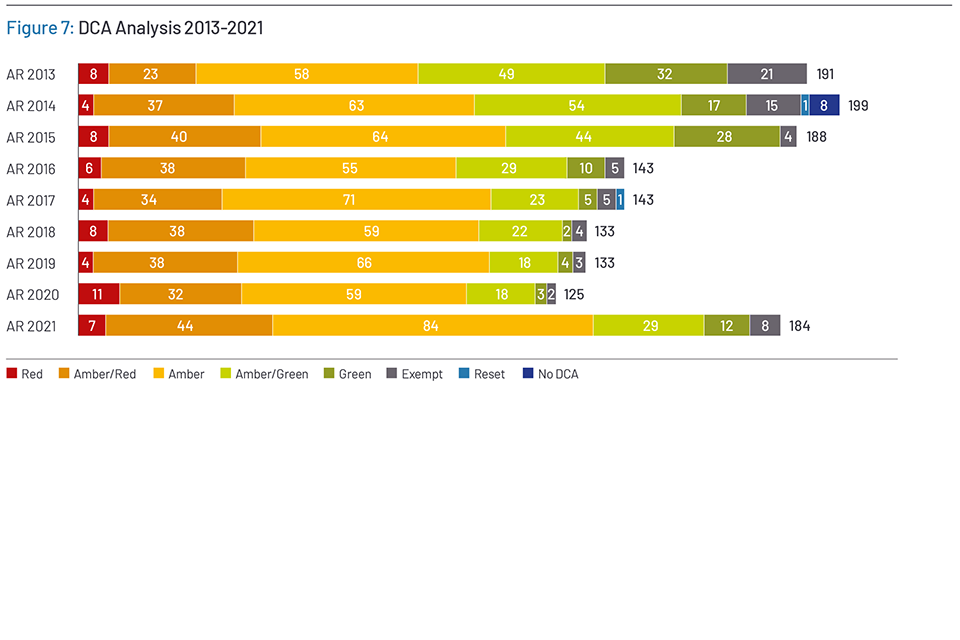 The IPA assesses the likelihood of each project delivering its objectives to time and cost with a Delivery Confidence Assessment (DCA). Ratings are categorised into five groups, which span a range from Red to Green, with each providing an indication of the likelihood of successful delivery and level of associated risks. Detailed definitions of each rating can be found in Annex A. DCAs are not a comprehensive reflection of project performance but reflect a project’s likelihood of success at a specific snapshot in time if issues and risks are left unaddressed. They are reviewed quarterly by the IPA and change depending on the challenges projects are facing, the results of focused independent assurance reviews and actions taken by projects. By taking the right steps following reviews and managing delivery challenges effectively, DCAs are often improved over time.