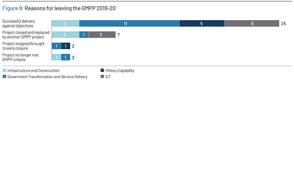 Since last year’s Report, 36 projects have left the GMPP. In most cases a project leaves the GMPP when it has been successfully delivered or no longer demands regular IPA support; for instance, where a project reaches a business-as-usual stage of delivery, readiness to leave is judged by the IPA alongside departments. Of the 36 projects that left the GMPP this year, 25 were on track to deliver against their objectives and expected benefits.