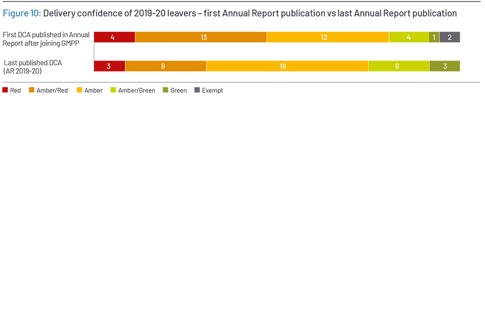 Projects join the GMPP at an early stage of their lifecycle and consequently with an uncertain delivery confidence. This is illustrated in the initial published DCAs for this year’s leavers cohort: of the 36 projects that left the GMPP in the last year, 17 started with a Red or Amber/Red DCA while 5 projects started with a Green or Amber/Green DCA. Over the course of their time on the GMPP, 9 projects left the GMPP with a Green or Amber/Green delivery confidence. Considering the complexity of these projects and the challenging delivery environment this is a positive performance and shows improvements over time.