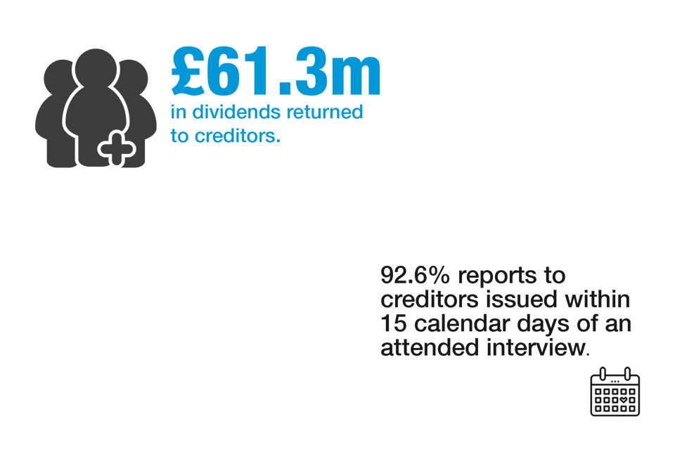 We returned over £61.3 million to creditors in the current year, up from the £55.3 million we reported in last year’s report. The recycling of funds lost through insolvencies is vital to ensure confidence in our economy.