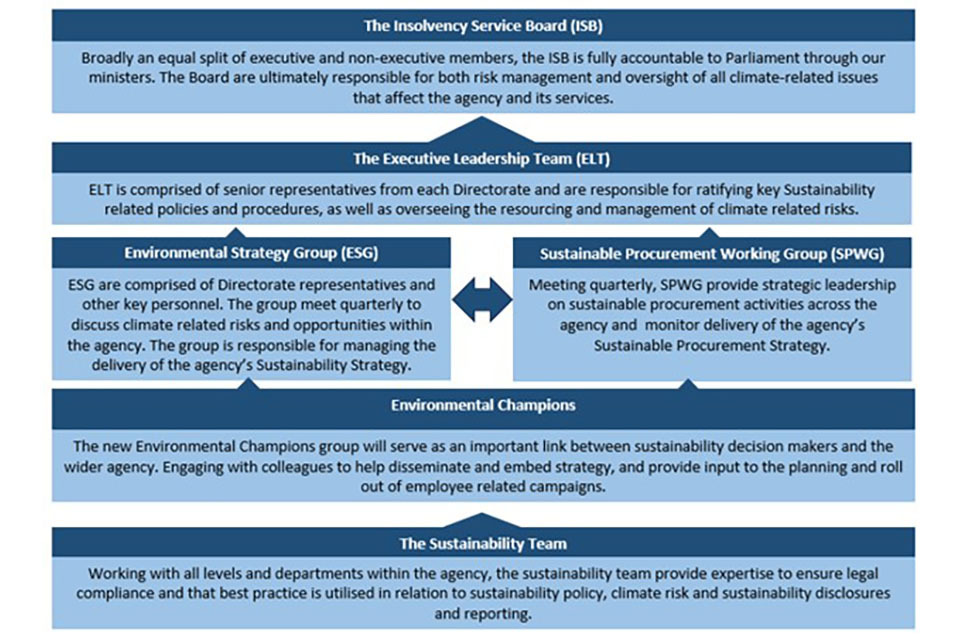 We are governed by the Insolvency Service Board, comprised of executive and non-executive members. The Board is responsible for the long-term success of the Agency, which includes setting strategic aims and objectives, making sure that leadership and other resources, including an effective risk management and assurance framework, are in place, challenging and supporting management performance, and reporting to DBT.