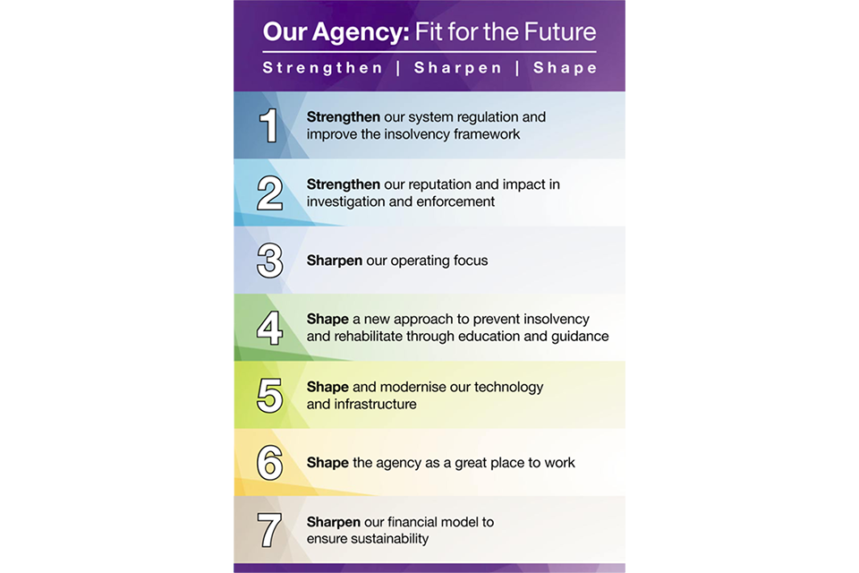 We oversee and foster a world class insolvency regime. Our core objective is to deliver economic confidence by supporting those in financial distress, tackling financial wrongdoing and maximising returns to creditors.