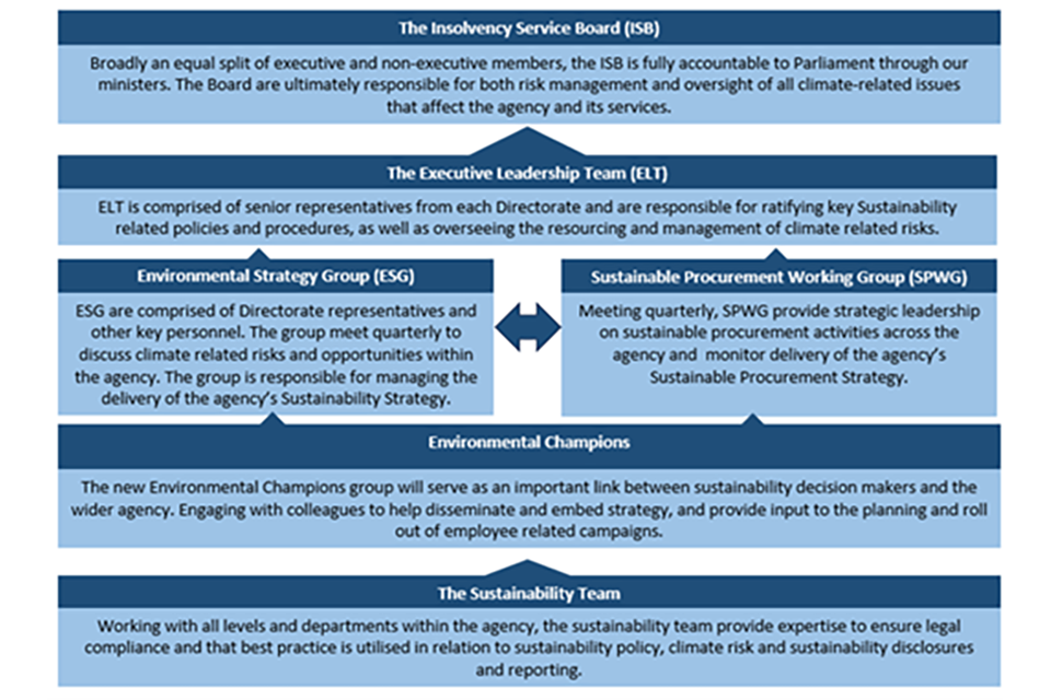 We are governed by the Insolvency Service Board, comprised of executive and non-executive members. The Board is responsible for the long-term success of our agency, which includes setting strategic aims and objectives, making sure that leadership and other resources, including an effective risk management and assurance framework, are in place, challenging and supporting management performance, and reporting to DBT.