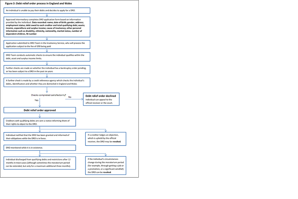 DROs are an administrative rather than a court procedure. Individuals enter the web-based DRO application system through an approved intermediary (a trained debt advisor). The intermediary discusses the individual’s financial position, and completes the DRO application on behalf of the individual before submitting it to the Insolvency Service’s DRO team. The official receiver decides whether or not to grant the DRO. A simplified summary of the DRO process is summarised in Figure 3 below. Note that on 6 April 2024, the £90 application fee was abolished.