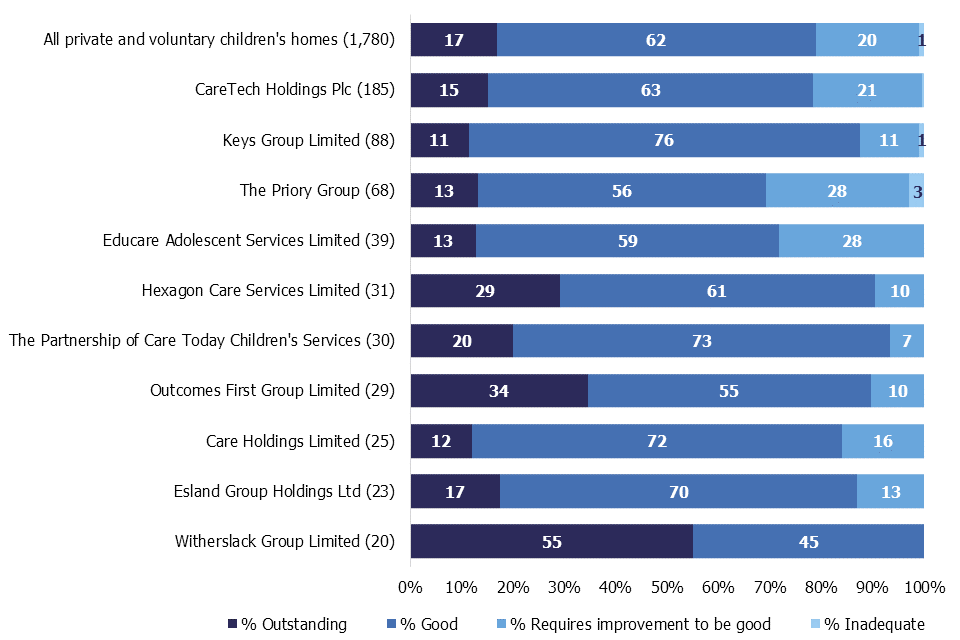 Bar chart showing 8 of the top 10 largest providers of children’s homes had a higher proportion of good and outstanding children’s homes than the average nationally.