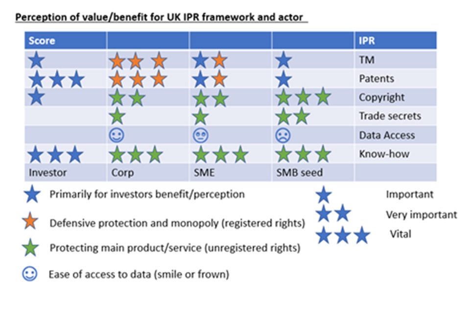 the UK IP framework is broadly regarded as trusted and reliable and not of concern in investment decisions, perceived as a background hygiene factor. However, it was noted that early-stage AI start-ups lacked experience of using the UK IP framework