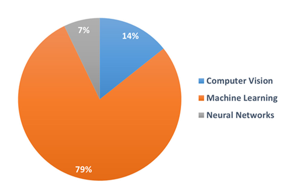 Figure A1.1 - A pie chart showing the split in the types of AI used by companies’ respondents, and indicating that Machine Learning is most common at 79%, followed by Computer Vision at 14% and Neural Networks at 7%