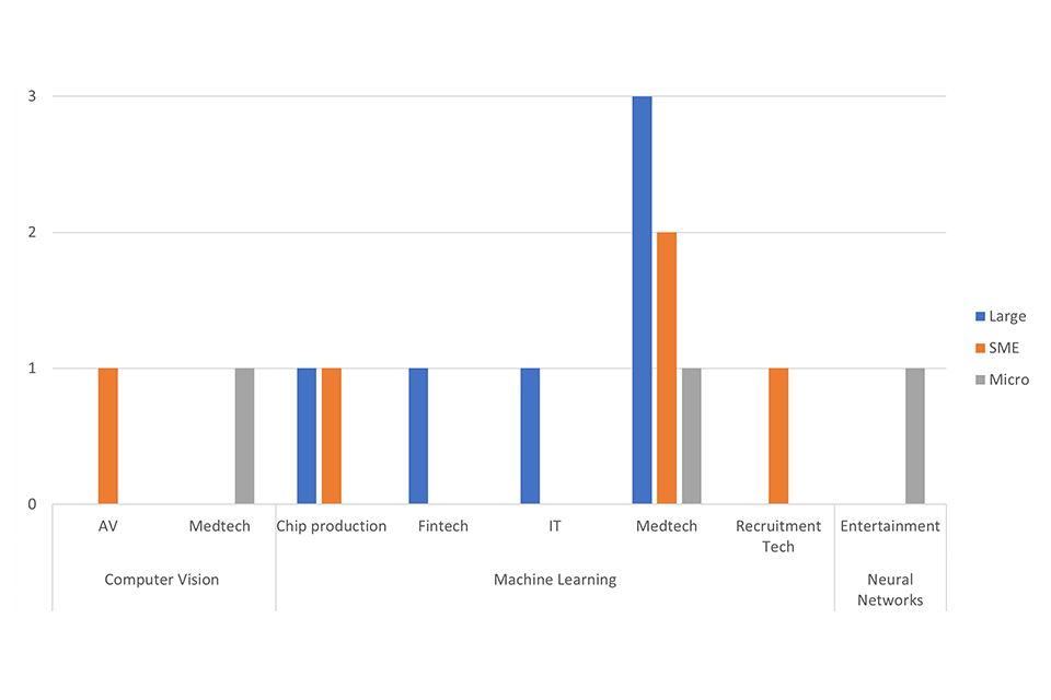 Figure A1.2 - A barplot indicating the split by type of AI used and field of application across Micro, SME and large companies interviewed