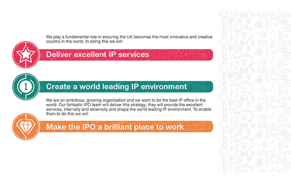 Fundamental role and the services we offer - Deliver excellent IP services, Create a world leading IP environment, Make the IPO brilliant place to work