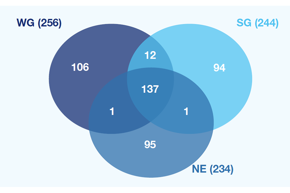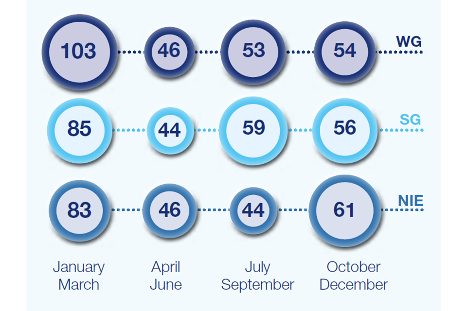All meetings also included UK Government. A total of 106 meetings took place only between UKG and WG, 12 between UKG, WG and SG and 1 between UKG, WG and NIE. 94 meetings took place between UKG and SG, and 1 between UKG, SG and NIE. There were 95 meetings between UKG and NIE, and a total of 137 between UKG, WG, SG, and NIE.