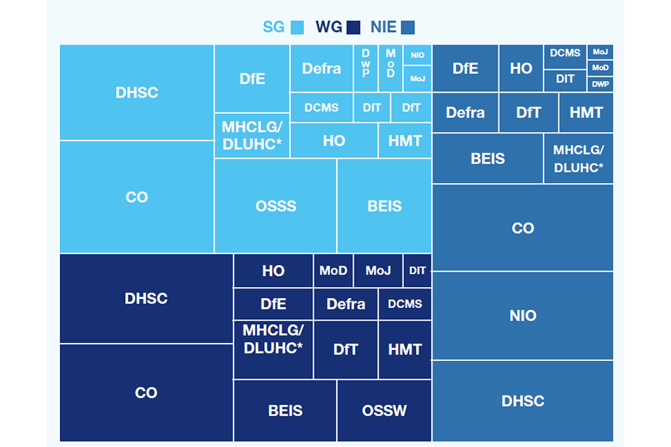 The prominence of the Cabinet Office and DHSC reflects the focus in 2021 on coordination of the UK response to, and recovery from, the COVID-19 pandemic.