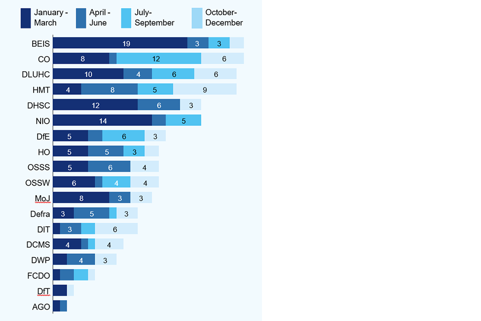 To note, from 11 February until the end of this quarter, the Northern Ireland Executive was not in place and, as such, senior civil servants attended in the absence of ministerial representation. The data was collected through a proforma completed by departments. The analysis was quality assured by an independent analyst. ↩