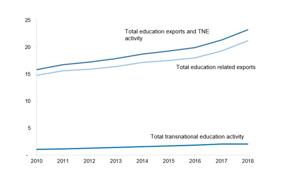Overall, education exports data for 2018 show that between 2010 and 2016, revenue gained from education exports rose at a consistent pace each year, from a base of just under £16 billion in 2010. This pace increased between 2016 and 2017. In 2017, education related exports and TNE activity were above £20 billion for the first time, reaching £21.4 billion, and increased again in 2018 to £23.3 billion. Since 2010, the estimated value of education related exports and TNE activity has risen by 46.7% in current prices[footnote 2] .