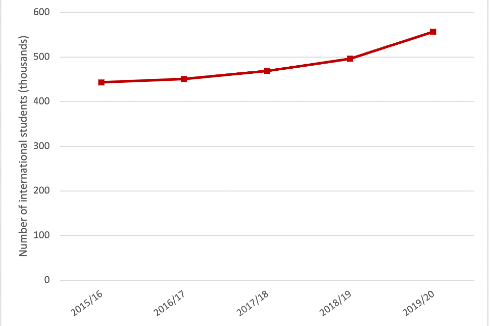 Growth figures pre-dating the coronavirus pandemic tell a positive story. Figure 1 shows growth in non-UK domiciled higher education students studying at UK providers, between 2015/16 and 2019/20. Numbers remain relatively constant between 2015/16 and 2016/17 and rise more steeply between 2017/18 and 2019/20. In the 2019 to 2020 academic year, the UK hosted around 560,000 international students. This was an increase of around 12% since 2019/20,[footnote 1] the largest of the decade and driven partly by a large increase in Chinese and Indian students. The total number of students from India more than doubled from 27,505 in 2018/19 to 55,465 in 2019/20.