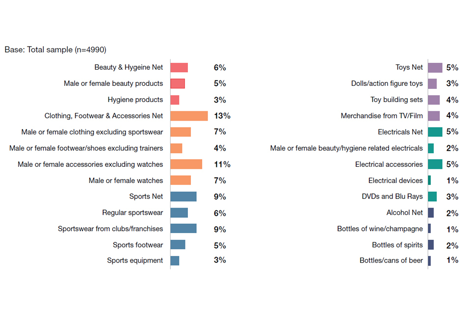 Respondents were most likely to have knowingly made counterfeit purchases of ‘Clothing, Footwear and Accessories’ and ‘Sports’ products, with 13% and 9% (respectively) of consumers of those categories having done so in the past year. Other categories experienced notably lower levels of counterfeit purchases: Beauty & Hygiene (6%), Electricals (5%), Toys (5%) and Alcohol (2%).