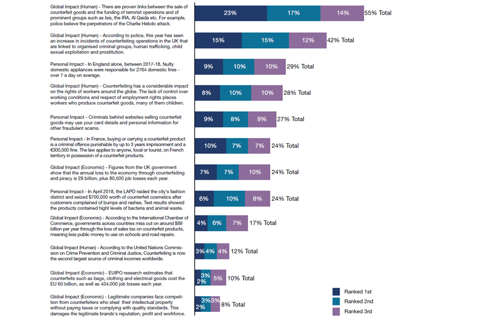 When asked to rank their top three messages, the most popular most often fell within the Global Impact (Human) category. The most effective single piece of messaging emphasised the links between terrorism and physical counterfeits and was selected by 55% of our sample. The second most effective piece of messaging (selected by 43%) highlighted the links between counterfeits and criminal organisations/activity.